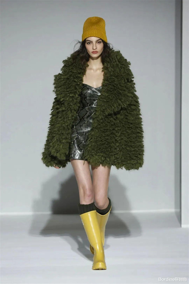 在短款的连衣裙和军绿色毛绒外套等之间的搭配,还在视觉的搭配上,对比也多了层次的气质感。