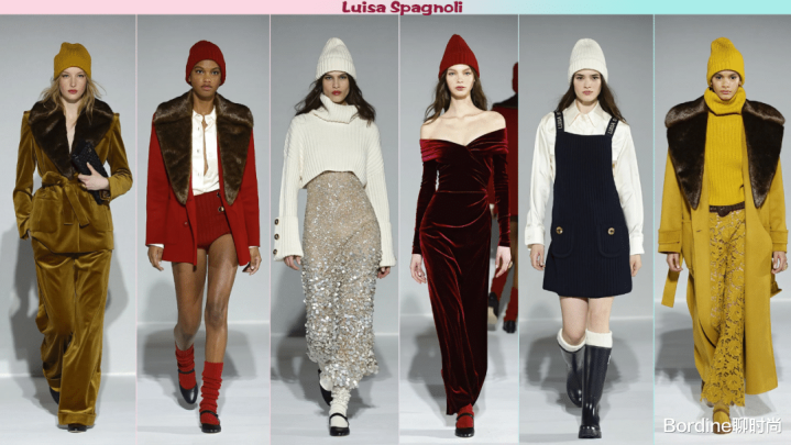 Luisa Spagnoli 2024秋冬系列,服装在纯色的颜色中,在针织面料、丝绒、亮片等材质的面料上,多了一些纹理质感,还在毛领、层次、腰带等设计的结合,让穿搭更多了时髦的优雅潮范儿。