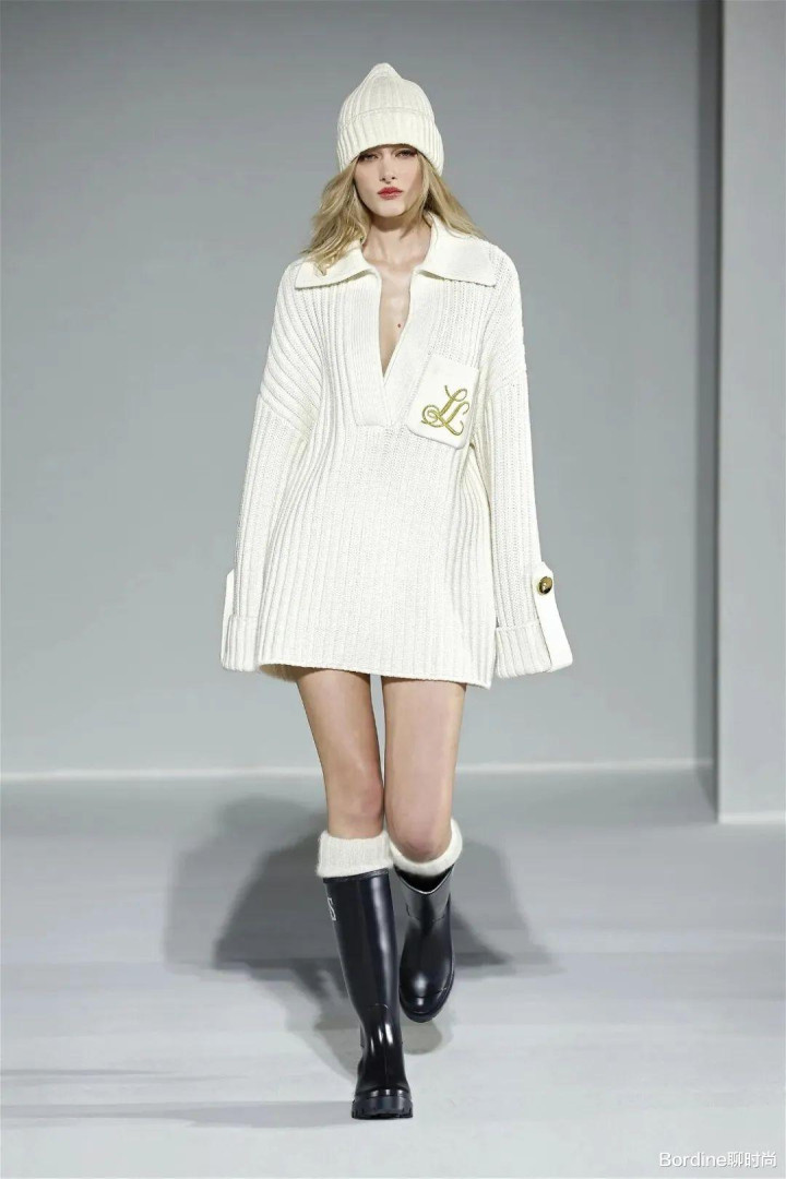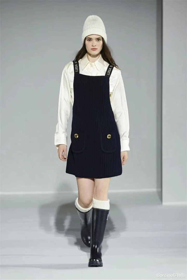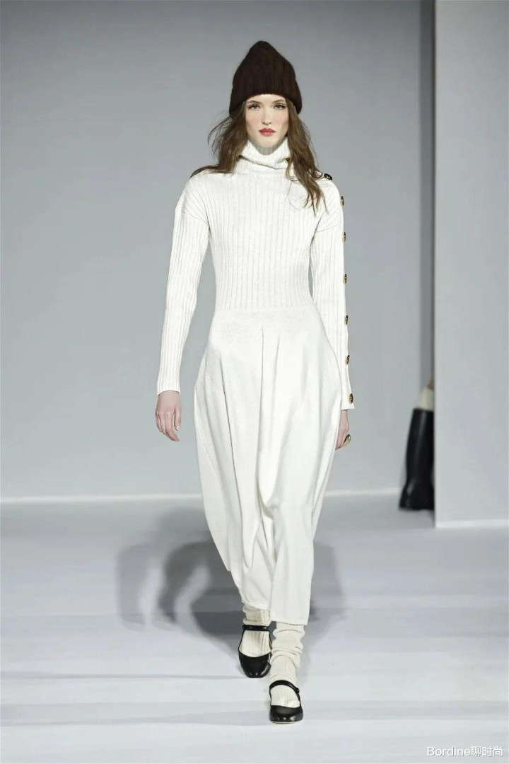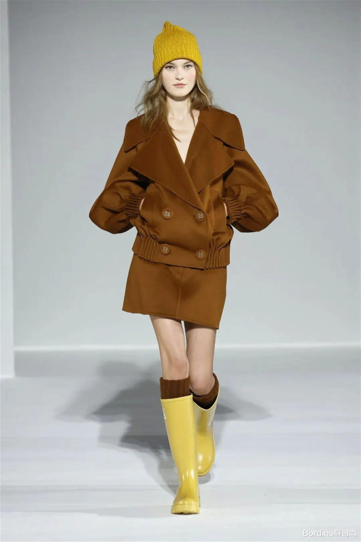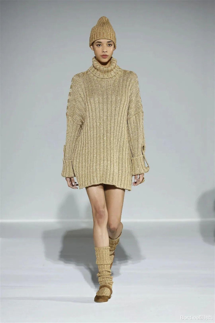 在棕色的颜色上,低调朴素中,纯色的简约也在针织面料的纹理中,还在落肩的随性和裙装的优雅中,和堆堆袜的的搭配,褶皱元素也多了几分随性的设计感。