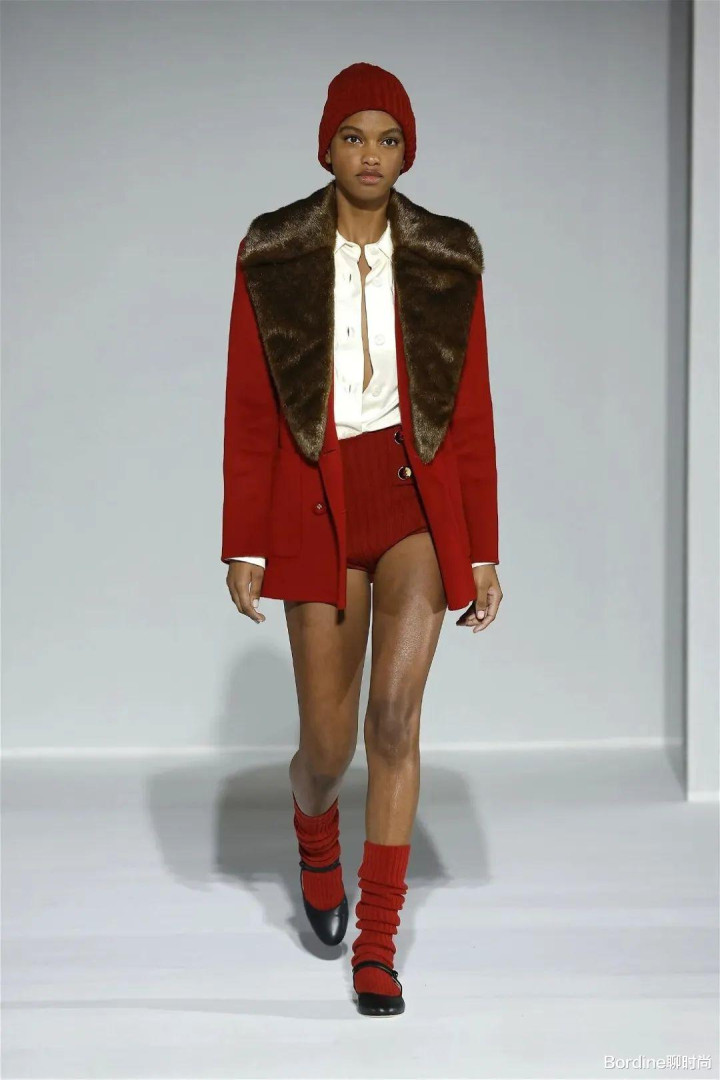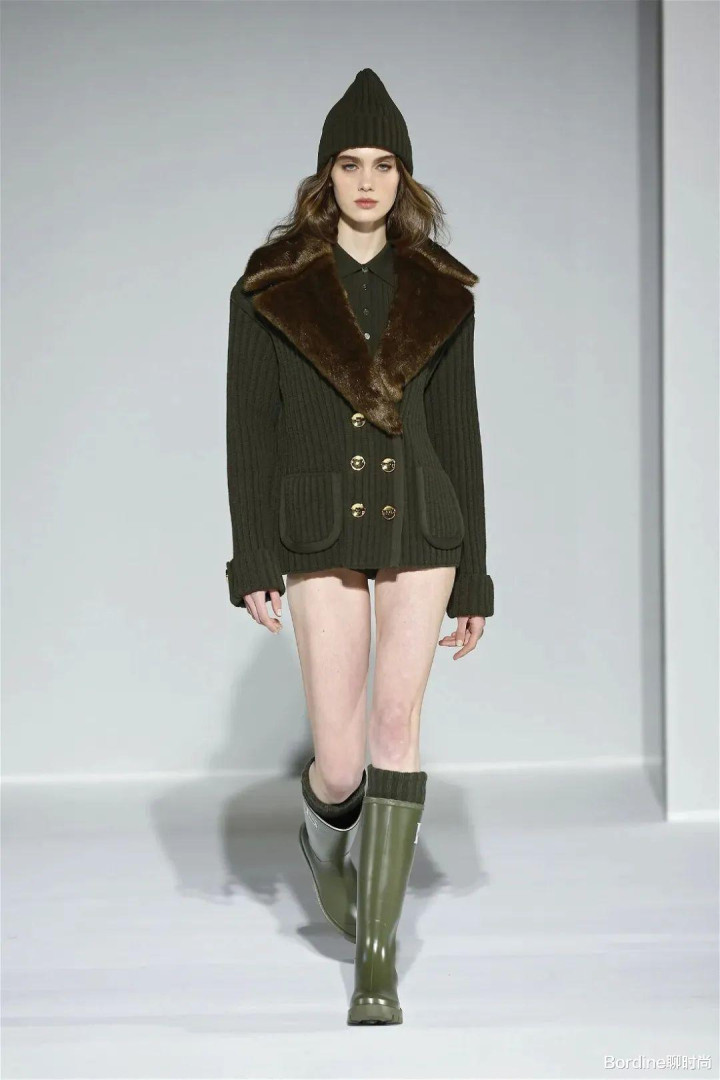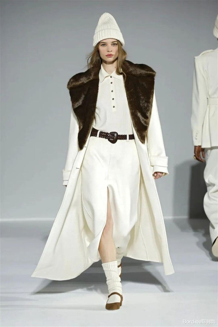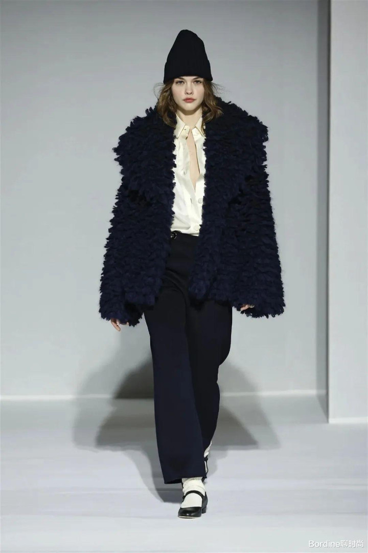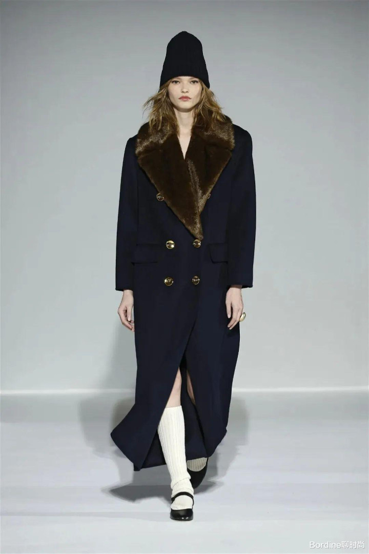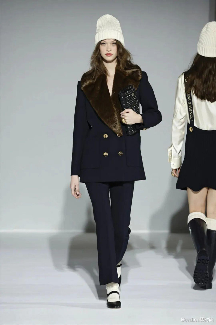 Luisa Spagnoli2024秋冬系列,纯色服装的简约中,一些毛绒纹理质感的面料也更添质感,而在这些西服元素、大衣等款式上,直线线条也多了几分利落和一些舒适的时髦。
