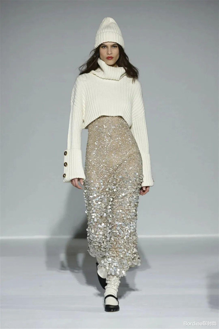 白色的上衣在针织面料的纹理质感中,也有条纹的简约经典,质感的加持在短款的款式中,拉高了腰线,在高领和袖子等装饰多了细节感;与亮片裙装的搭配,也多了质感对比和时尚感。