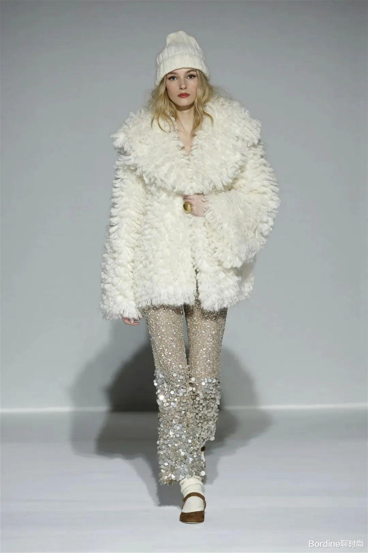 白色的上衣和下装在搭配中,也在毛绒皮草和光泽亮片等元素之间的结合,有着更多质感的对比,更添时髦的潮范儿气质。