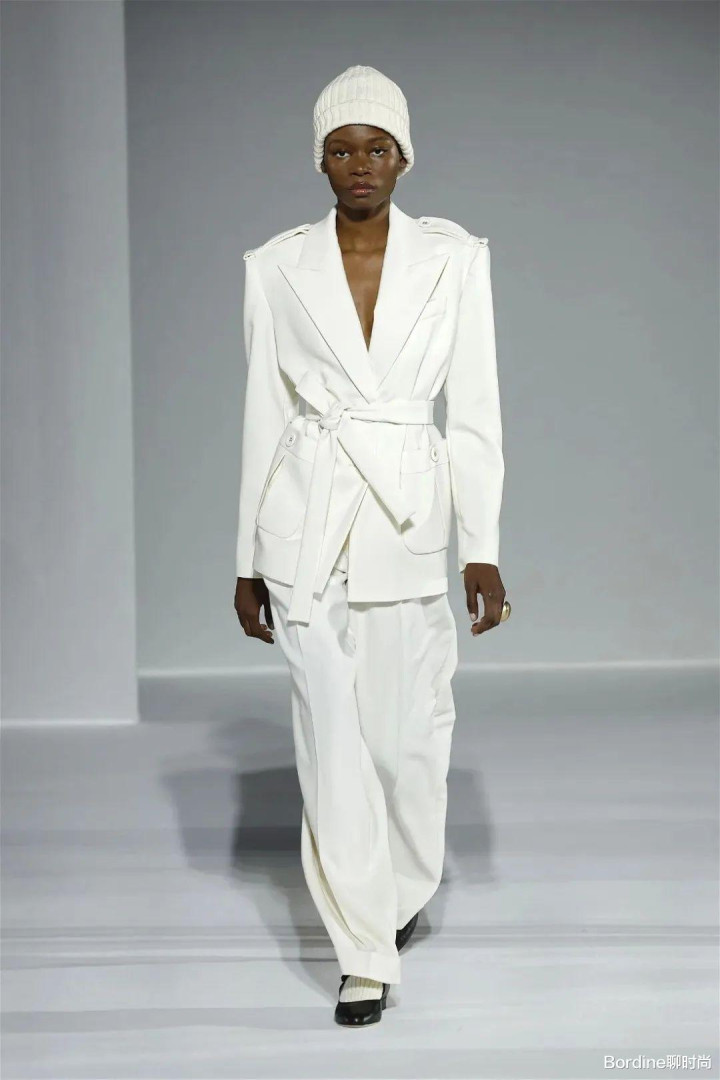 这套服装在纯白色的颜色中,气质干净优雅,纯色的大方中,套装穿搭也多了几分利落,腰带的收腰多了曲线的柔美,还有宽松直筒裤更多了一些廓形感。