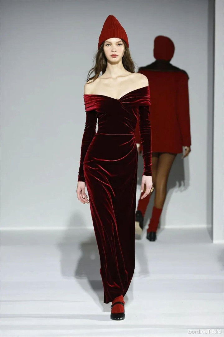 酒红色的颜色在色彩的稳重优雅之中,纯色颜色的简约中,一字肩的款式多了一些肩颈曲线的线条感,在丝绒材质和修身廓形的结合中,也多了优雅高级感。