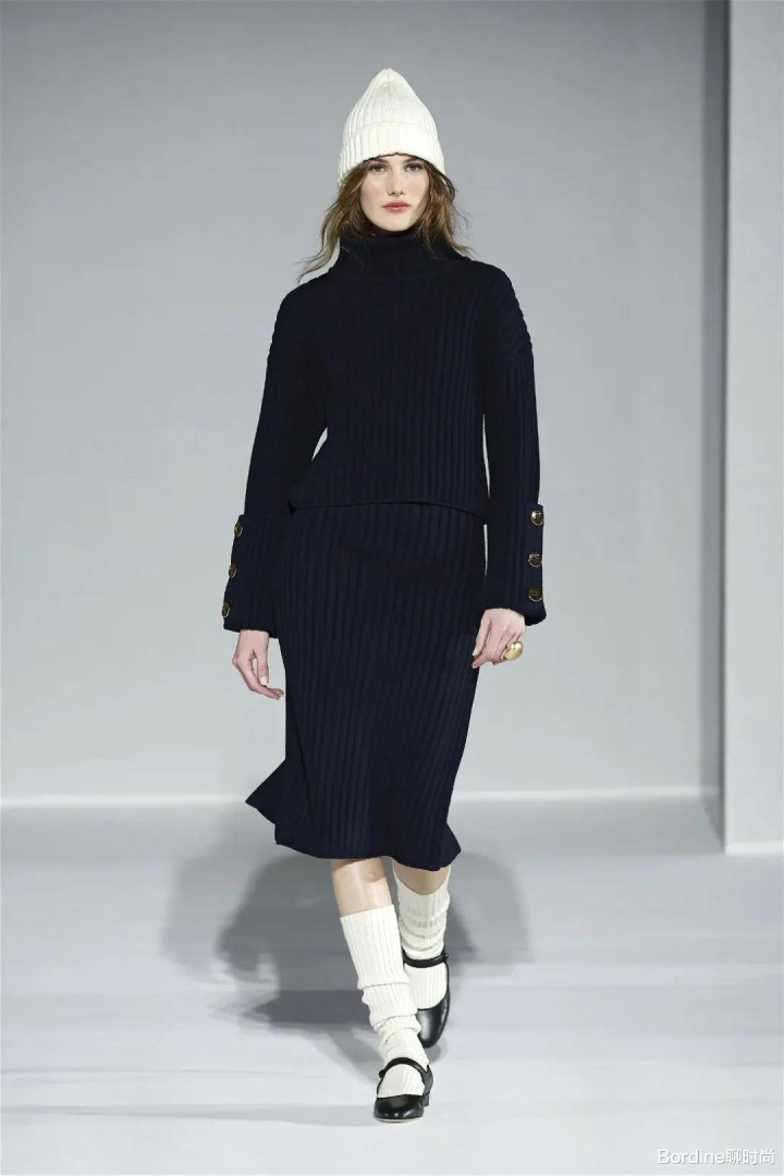 黑色的裙装在纯色的简约大方中,针织的面料增加了一些材质的纹理质感,还在高领等款式之上,也多了一些温暖暖意。