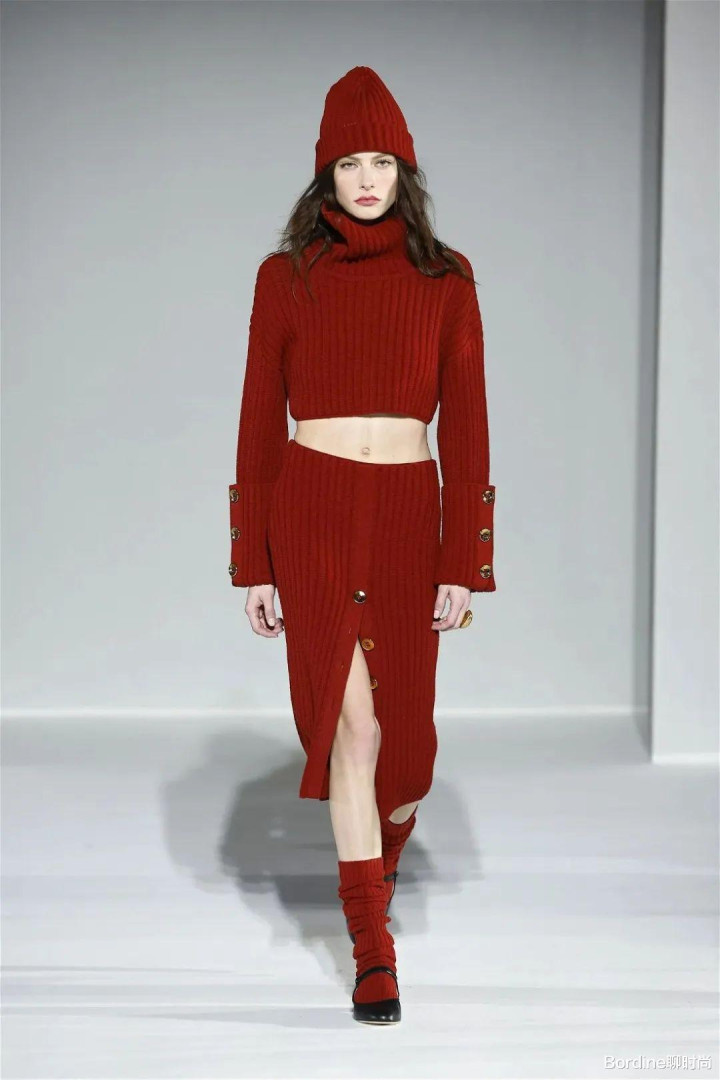 红色的服装套装也在纯色的简约热情中,套装大方,还有针织面料的纹理时尚,结合了开叉下摆、露腰设计和高领等设计。