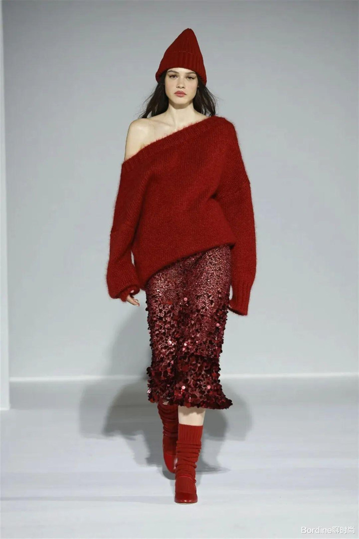 在红色颜色为主的穿搭中,红色颜色的优雅,也在针织和亮片等材质之上,更有质感的差异时尚,结合斜肩等设计,多了一些特色。