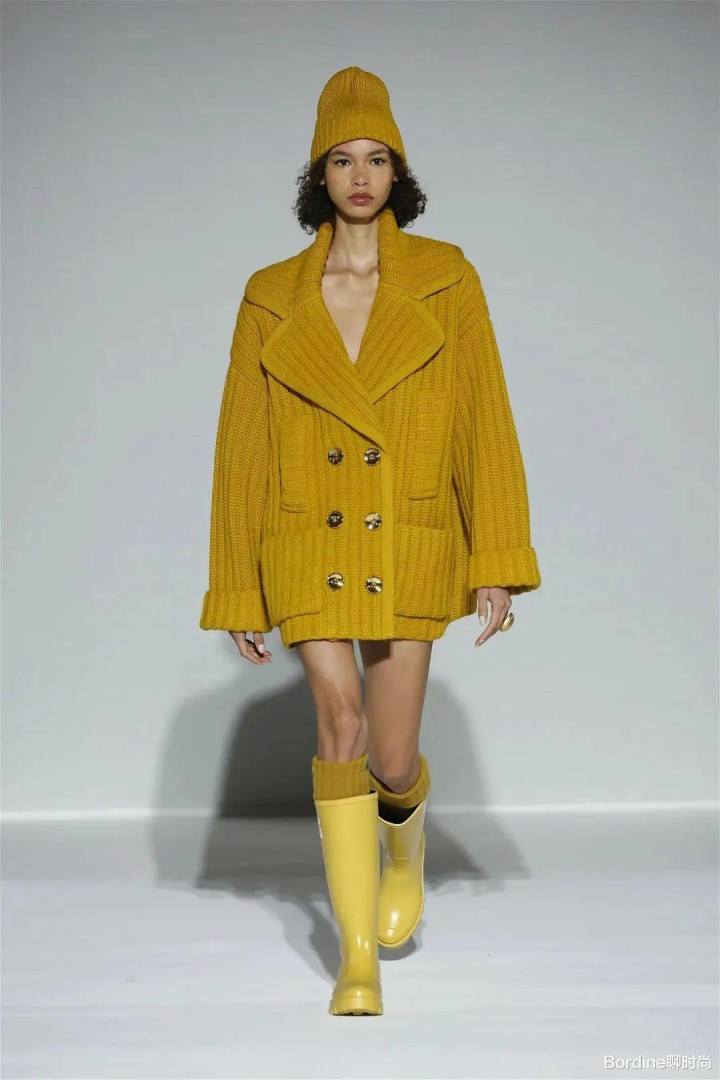 姜黄色的颜色在色彩的生机稳重中,纯色的简约也在针织面料上增加了材质的质感,更有宽松廓形和落肩等设计多了一些休闲随性。