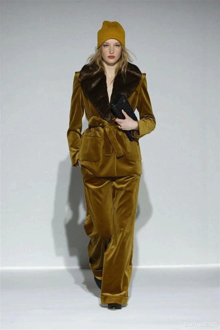 服装在棕色系的颜色中,这些穿搭更有棕色颜色的低调大方,纯色的简约中,还有丝绒材质的纹理,套装穿搭在深棕色毛领的搭配,更有细节的装饰。